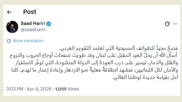 عايد الرئيس سعد الحريري اللبنانيين عموما وأبناء الطوائف المسيحية التي تعتمد التقويم الغربي خصوصا بالفصح، وكتب في منصة “X”: “فصحٌ مجيدٌ للطوائف المسيحية التي تعتمد التقويم الغربي. أسأل الله أن يحلّ العيد المقبل على لبنان وقد طويت صفحات أوجاع الحروب والنزوح والقتل والدمار، ليسير على درب العودة إلى الدولة المنشودة، التي توفّر الاستقرار والأمان لكل اللبنانيين، فنشهد انطلاقةً فعليةً نحو الازدهار وإعادة إعمار ما تهدم. كلنا أمل بقيامة جديدة لوطننا الغالي”.