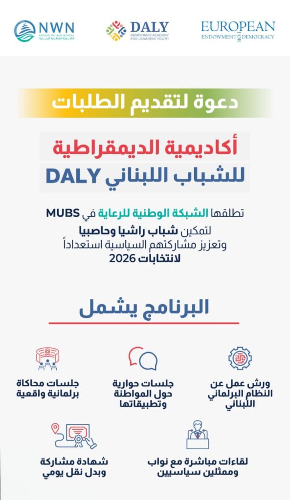 الشبكة الوطنية للرعاية (NWN) في جامعة MUBS تدعو الى تقديم طلبات المشاركة في أكاديمية الديمقراطية للشباب اللبناني (DALY)