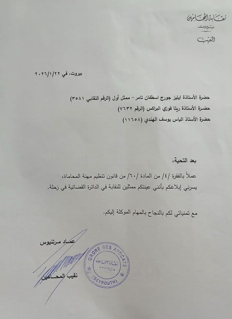 عملاً بالفقرة / ٤/ من المادة / ٦٠/ من قانون تنظيم مهنة المحاماة، يسرني إبلاغكم بأنني عينتكم ممثلين للنقابة في الدائرة القضائية في زحلة.